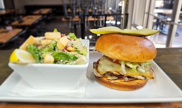 Charbroiled house-made beef patty, lettuce, tomato, red onion, mayo & mustard. Topped with a pickle on a brioche bun. Served with your choice of side.
