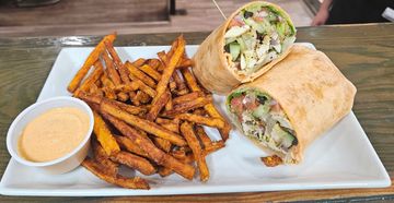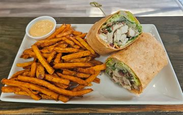 Crisp romaine, smoked bacon, creamy caesar dressing and parmesan cheese, wrapped in a warm tortilla. Served with your choice of side.