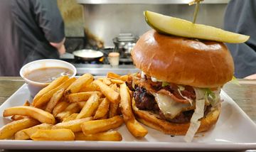Charbroiled house-made beef patty, smoked bacon, smoked cheddar, sauteed mushrooms, lettuce, tomato, red onion, mayo & mustard. Topped with a pickle on a brioche bun. Served with your choice of side.