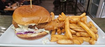 A piece of our beer-battered cod between a brioche bun. dressed with coleslaw, house-made tartar sauce & mayonnaise. Served with your choice of side.