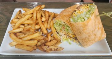 Taco beef, smoked cheese blend, lettuce, tomato, diced red onion, roasted tomato salsa and sour cream wrapped in a warm flour tortilla. Served with your choice of side.