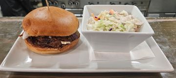 Pulled pork, slow cooked with our blend of spices and Dr. Pepper. Served on a brioche bun with coleslaw. Served with your choice of side.