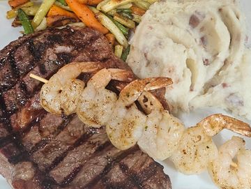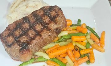 Marinated 12oz Sterling Silver AAA beef served with a side of garlic mashed potatoes & our feature steak vegetables.
