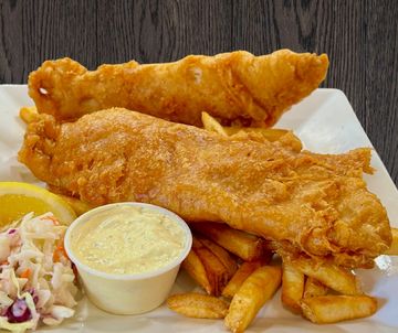 Two pieces of beer battered cod on a bed of Kennebec fries. Served with our house-made tartar sauce and coleslaw.