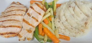 Juicy chicken breast served with a side of our garlic mashed potatoes and featured vegetables.