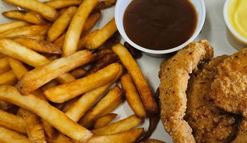 Crispy chicken tenders with honey mustard aioli. Served on a bed of Kennebec fries & a side of gravy.