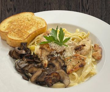 Creamy house-made white wine alfredo sauce, smothering fettuccini noodles. Topped with charbroiled chicken and garnished with parmesan and garlic toast.