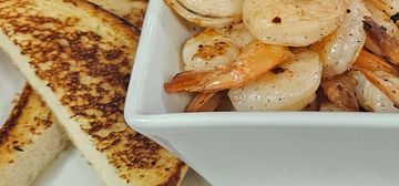 Tail-on shrimp cooked with garlic butter, served with garlic toast and with a side of cocktail sauce.