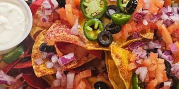 Fried corn tortilla chips, loaded with over half a pound of smoked cheeses, topped with tomato, red onion, black olive & jalapenos. Served with our roasted tomato salsa & sour cream.